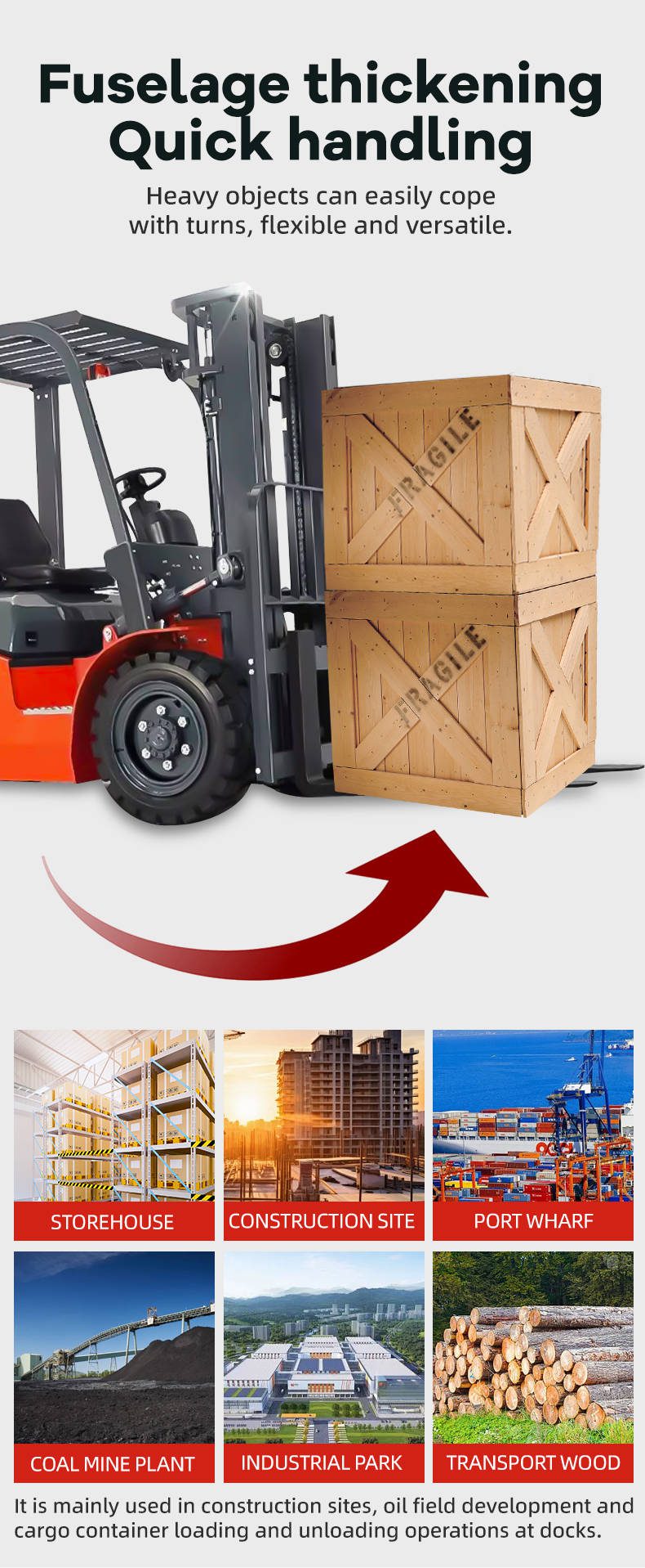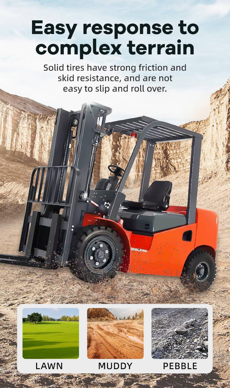 The diesel-powered four-wheel forklift is a forklift driven by a diesel engine, widely used in outdoor or more complex working environments. Its four-wheel design provides excellent stability and a higher load capacity, allowing it to carry heavy loads and operate smoothly on rough terrain. Diesel forklifts offer longer working hours and higher power output, making them suitable for prolonged, high-intensity operations. Compared to electric forklifts, diesel forklifts are more suitable for large-scale warehouses, construction sites, ports, and other locations that require high power and long endurance.