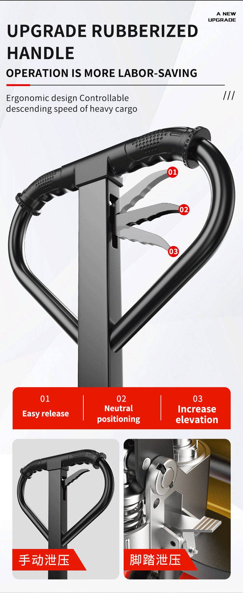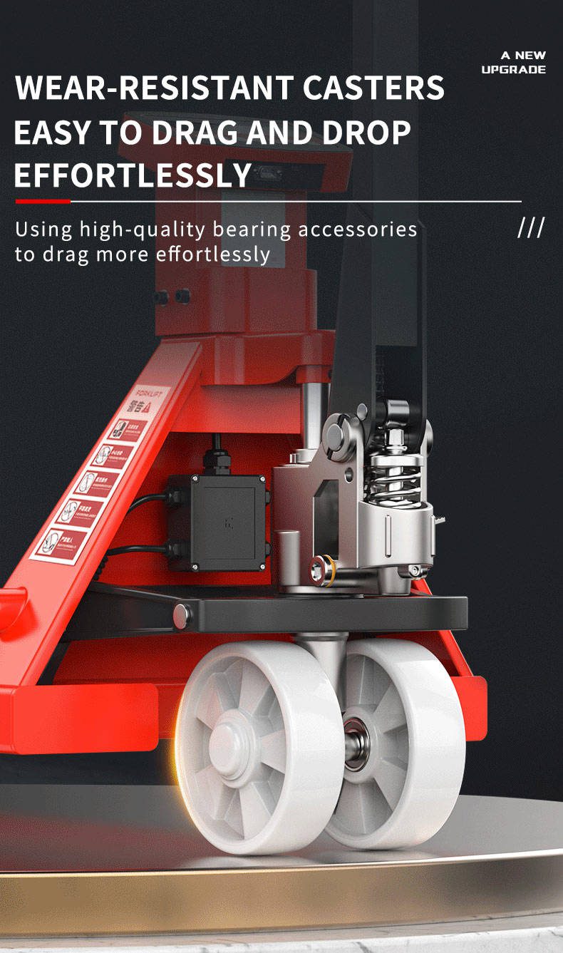 The Hand Pallet Truck with a built-in weighing scale features state-of-the-art instrumentation boasting an impressive accuracy level of 0.1% with a minimum size measurement of 1kg. It encompasses functionalities such as gross weight determination, tare function, cumulative weight addition, and complies with IP65 sealing standards, ensuring ease of washing and meeting high standards for water and dust resistance.