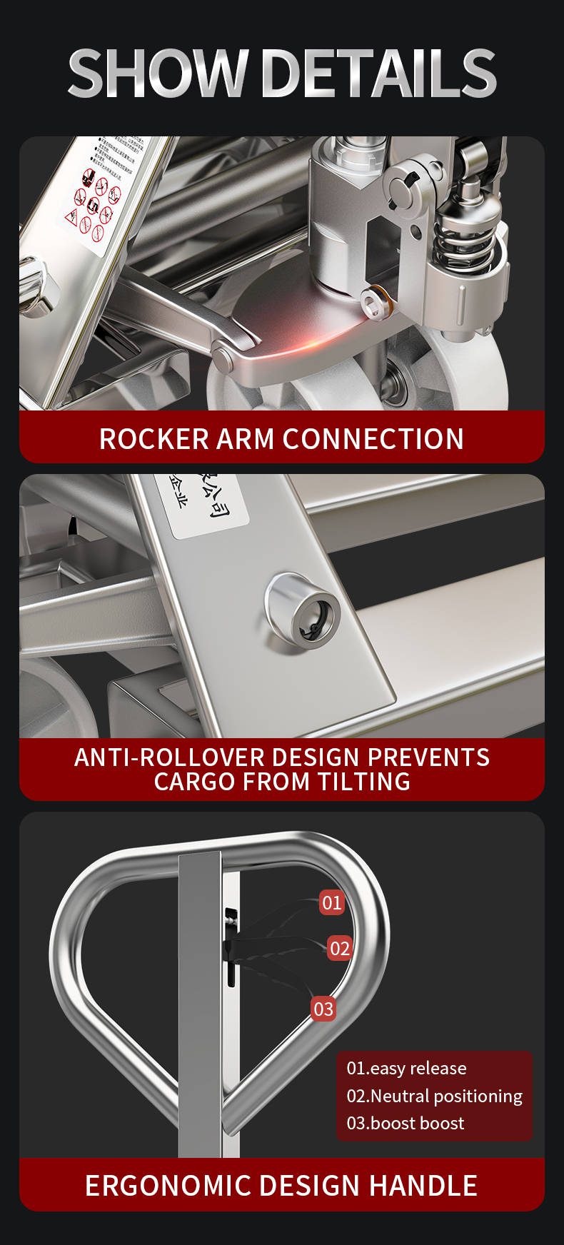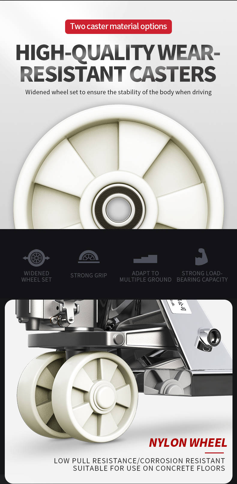 6) Options: PU/Rubber load wheels, single wheel, stainless steel, and galvanized trucks available, various fork lengths and widths, and backrests.